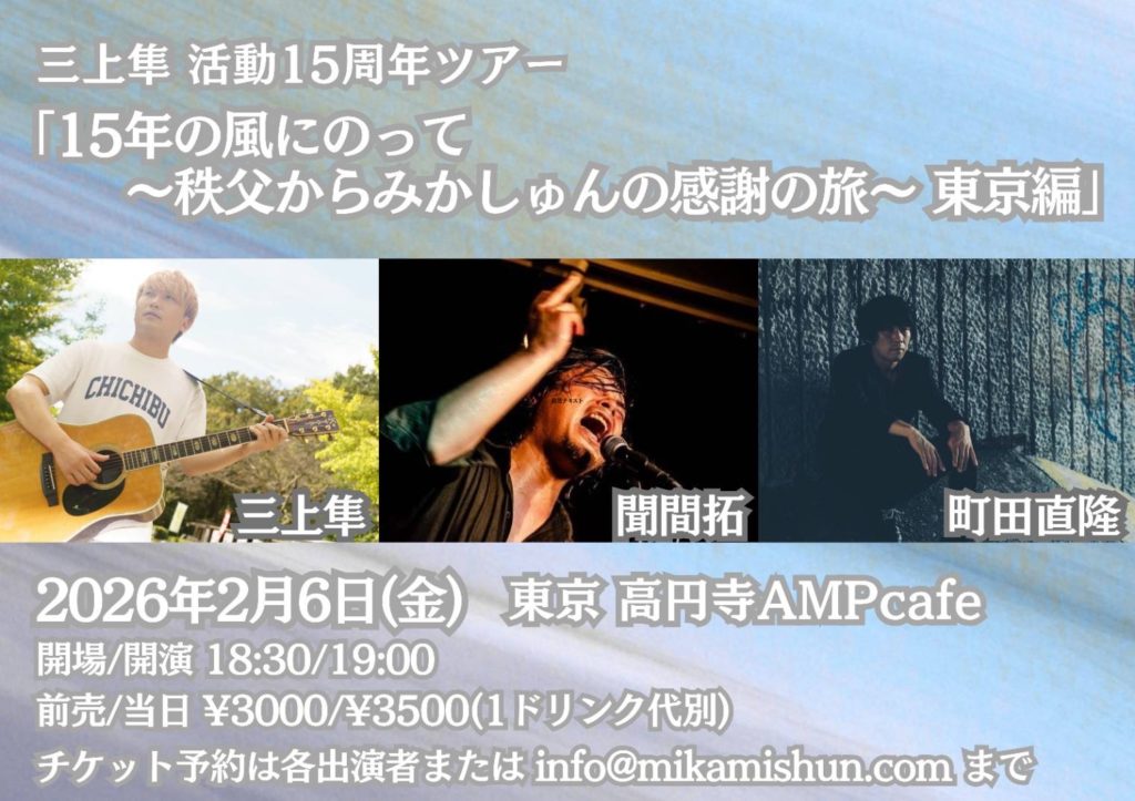 三上隼 活動15周年ツアー 「15年の風にのって ~秩父からみかしゅんの感謝の旅~ 東京編」 2026年2月6日(金) -出演- 三上隼 / 聞間拓 / 町田直隆 開場/開演 18:30/19:00 前売/当日 ¥3000/¥3500(1ドリンク代別) ※リクエスト曲がある方はお申し込み時にご記入ください(三上隼オリジナル曲のみ、1人1曲まで) ※11/11(火)20:00〜よりチケット受付開始 会場: 東京 高円寺amp cafe 〒166-0003 東京都杉並区高円寺南4丁目30-1 席数 1 2 3 4 5 6 7 8 9 10 11 12 13 14 名前 電話 メールアドレス コメント