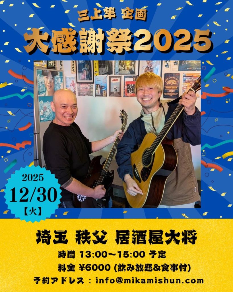 今年1年の感謝を込めて、居酒屋大将の絶品料理とお酒を嗜みながらビンゴ大会やミニライブを予定しています。
